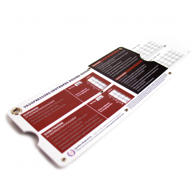 This pocket protocol card offers quick access to ACLS IV drips and standard adult doses for Epinephrine, Norepinephrine, Dopamine, and Dobutamine. Designed to lock in place, this slider card features a pre-calculated medication chart for an easy-to-read format with weights available in both kilograms and pounds. Many different providers use these cards everyday, including first responders, EMTs, and healthcare professionals the United States.